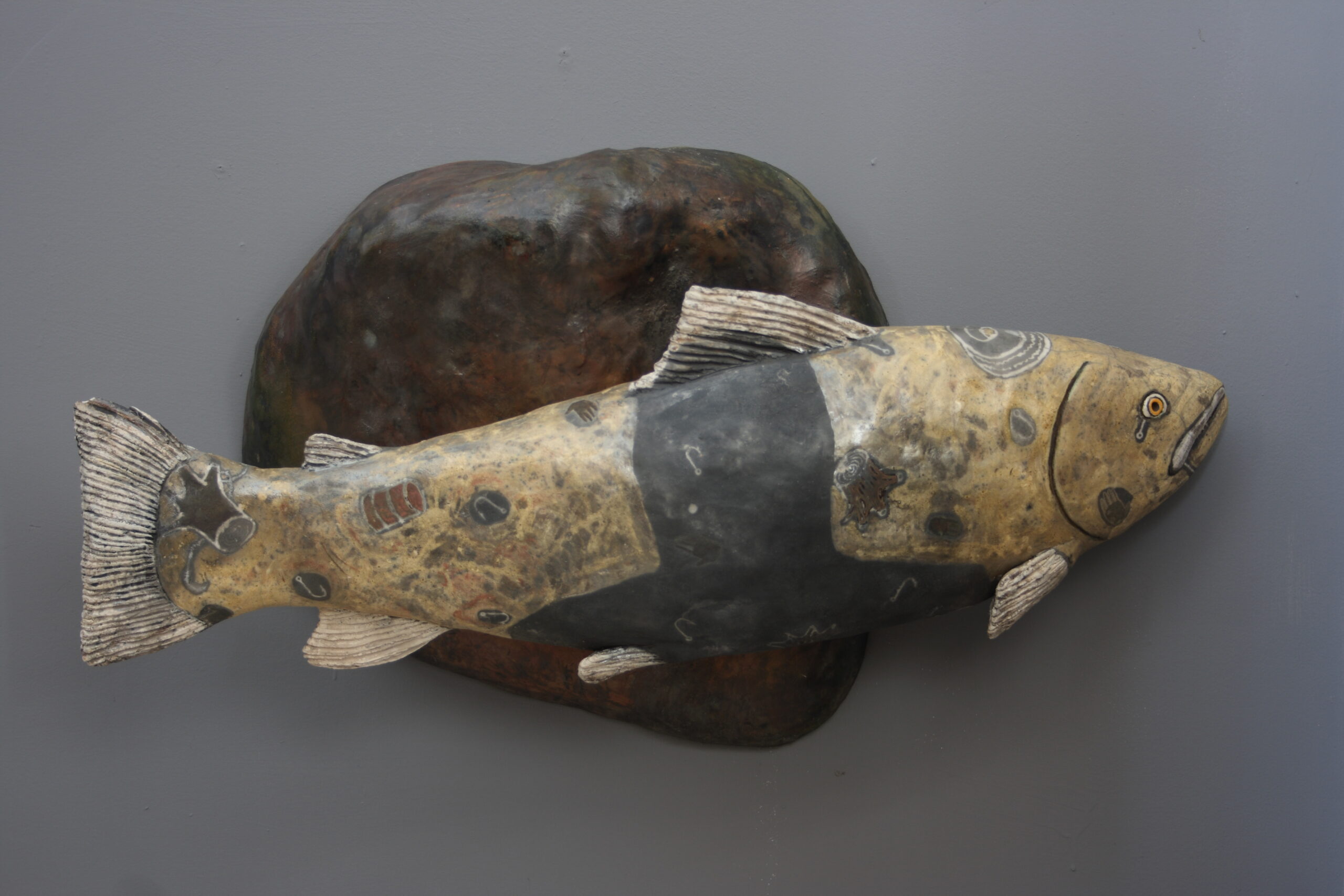 This striking 39" long, mixed-media sculpture called "Between a Rock and a Hard Spot" donated by artist Stephen Braun for sale at our upcoming Wonderland Auction on December 14, 2013 is masterfully emblematic of Cascadia Wildlands work and the challenges we face. This generic salmon festooned with symbols representing human pressures—clearcuts, oil barrel, tires and hooks—is not only visually appealing but encapsulates many of the challenges we face in protecting this iconic fish. According to the artist “when hung properly the silhouette on the fish will be covered by the shadow of the viewer” hence the rock and the hard spot title as we, the viewer, are the hard spot. Thought provoking and beautiful.