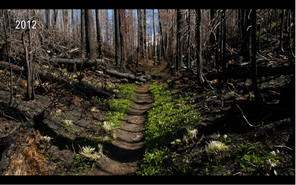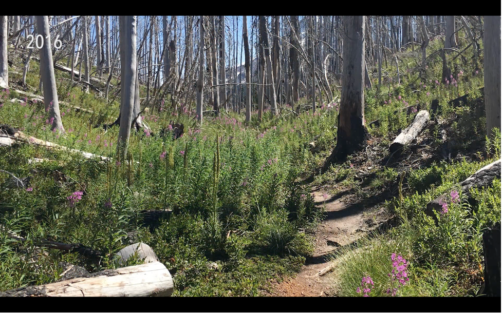 A charcoal forest already greening up shortly after a severe Oregon wildfire (top, 2012) and regenerating beautifully, four years later (bottom, 2016) (image screen grabs from “Born in Fire”, thrivingwithfire.org).