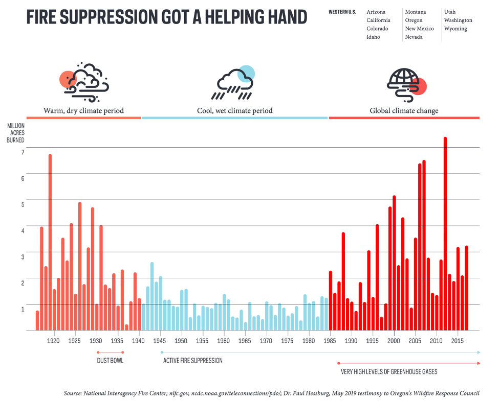 As to whether large wildfires will become the “new normal” under climate change, the truth is that large wildfires are just … normal. In recent decades, we’ve emerged from an unusually wet time period that coincided with federal policy encouraging fire suppression, so our expectations of a normal fire year are based on an abnormal baseline. Large wildfires – even so called “mega-fires” – are the historic norm west of the Cascades. We may start to see increased drought and extreme weather due to climate change, though, and that will certainly influence fire behavior in years to come.