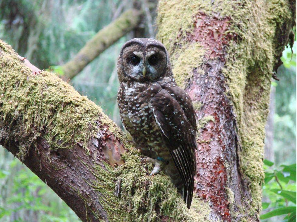 A northern spotted owl on an old-growth tree (photo by Charles Yackulic/U.S. Forest Service – Pacific Northwest Research Station).