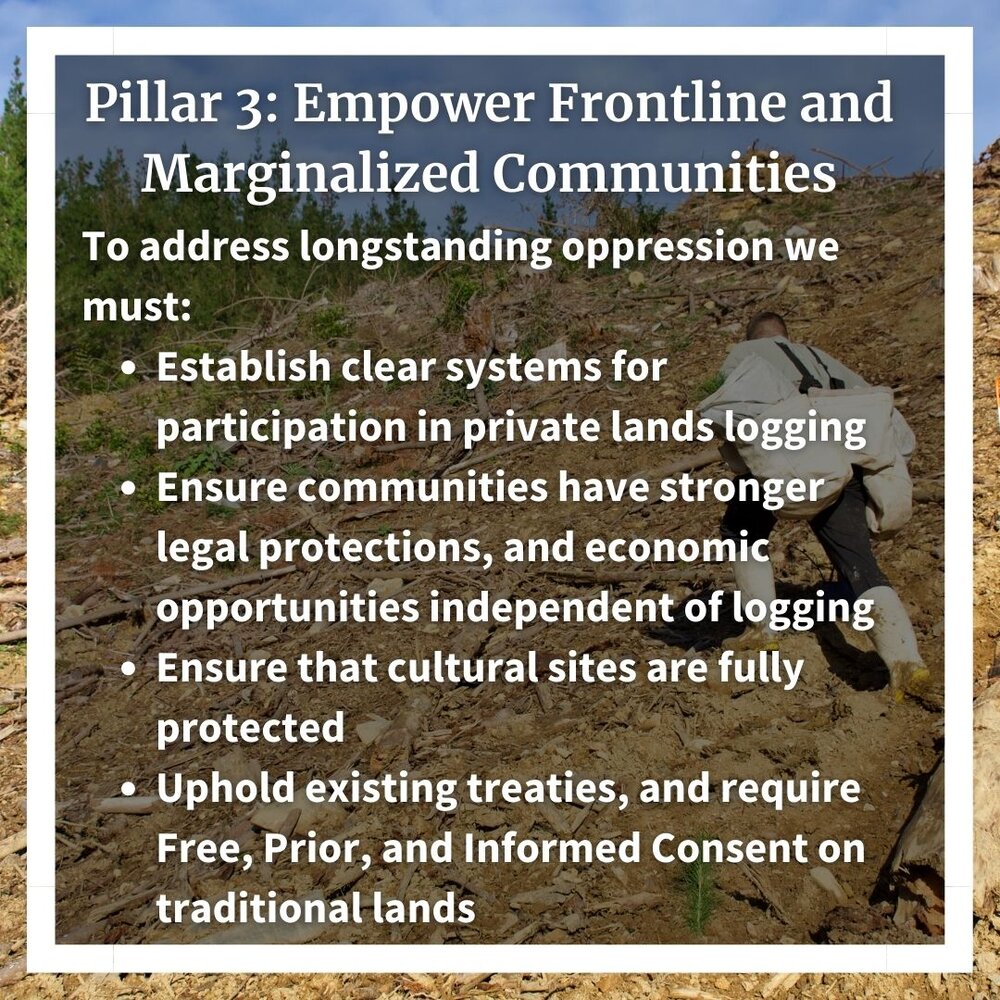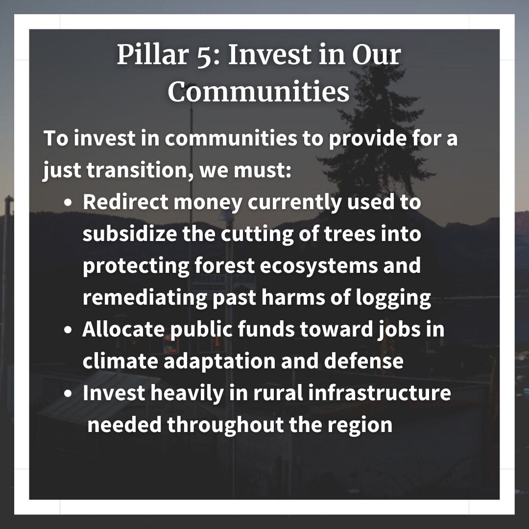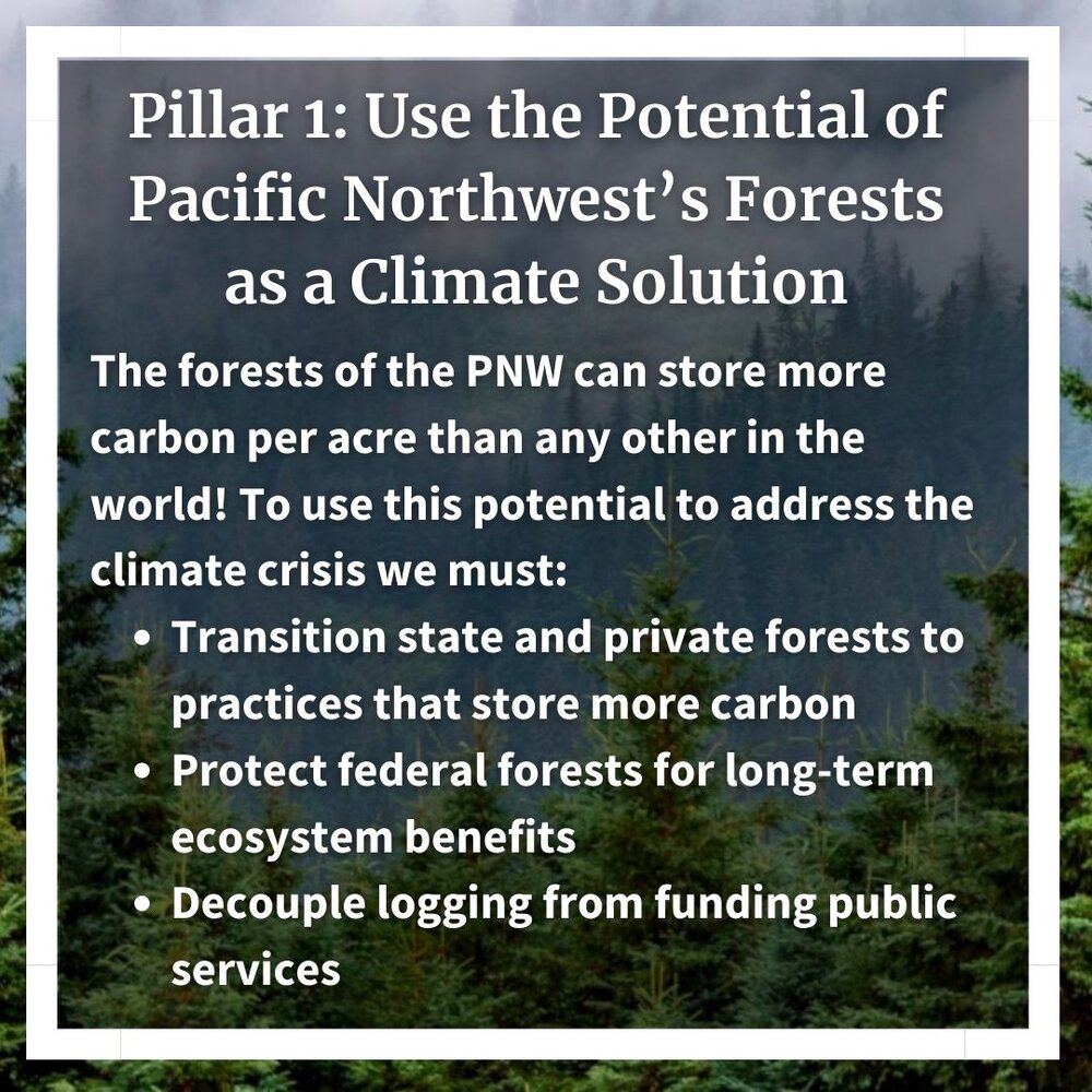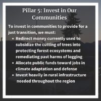 The six pillars of the Green New Deal for Pacific Northwest Forests address the intersecting issues of industrial logging, climate change, species collapse, economic injustice, and the disempowerment of frontline communities.