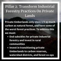 In June 2021, over fifty forest and climate justice organizations across northern California, Oregon, and Washington released a sweeping Green New Deal for Pacific Northwest Forests platform calling for the transformation of current forest practices on private, state, and federal land in the face of the climate crisis and ecological collapse. The platform emphasizes the critical role that the forests of the Pacific Northwest must play in efforts to mitigate climate change and to safeguard communities from climate impacts such as wildfire and drought.
