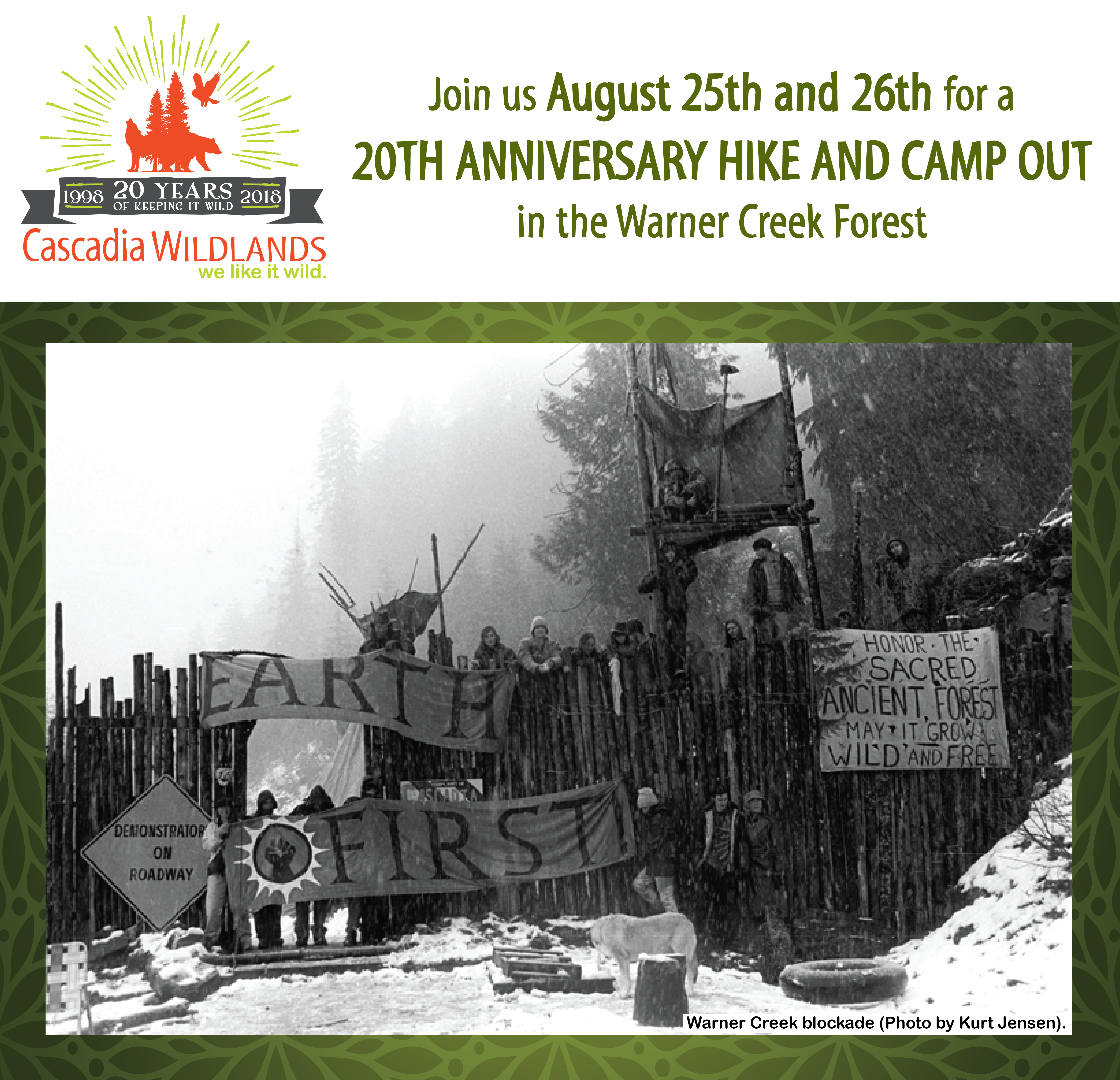 Join the Cascadia Wildlands family on a hike and campout in the historic Warner Creek forest east of Oakridge to celebrate our 20th year as an organization fighting for wild landscapes and threatened species throughout Cascadia. We’ll spend the afternoon hiking across Bunchgrass Ridge through the fire area, learning about fire ecology from resident experts, hearing stories from Cascadia’s forest defense history and taking our celebration into the night with a group dinner and campout in this beloved forest. This is a kiddo-friendly event!