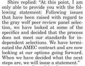 It is a system with a lot of slop in it, but that is really what we should expect in a democracy attempting to reconcile a menu of conflicting positions. What we should not expect is what we are getting now in regards to the scientific peer-review process for the wolf delisting process and the Service’s selection of AMEC as the consultant for this process (see above quote from Gavin Shire information officer at USFWS in Todd Wilkinson’s excellent piece). Badly done. Badly done, indeed.