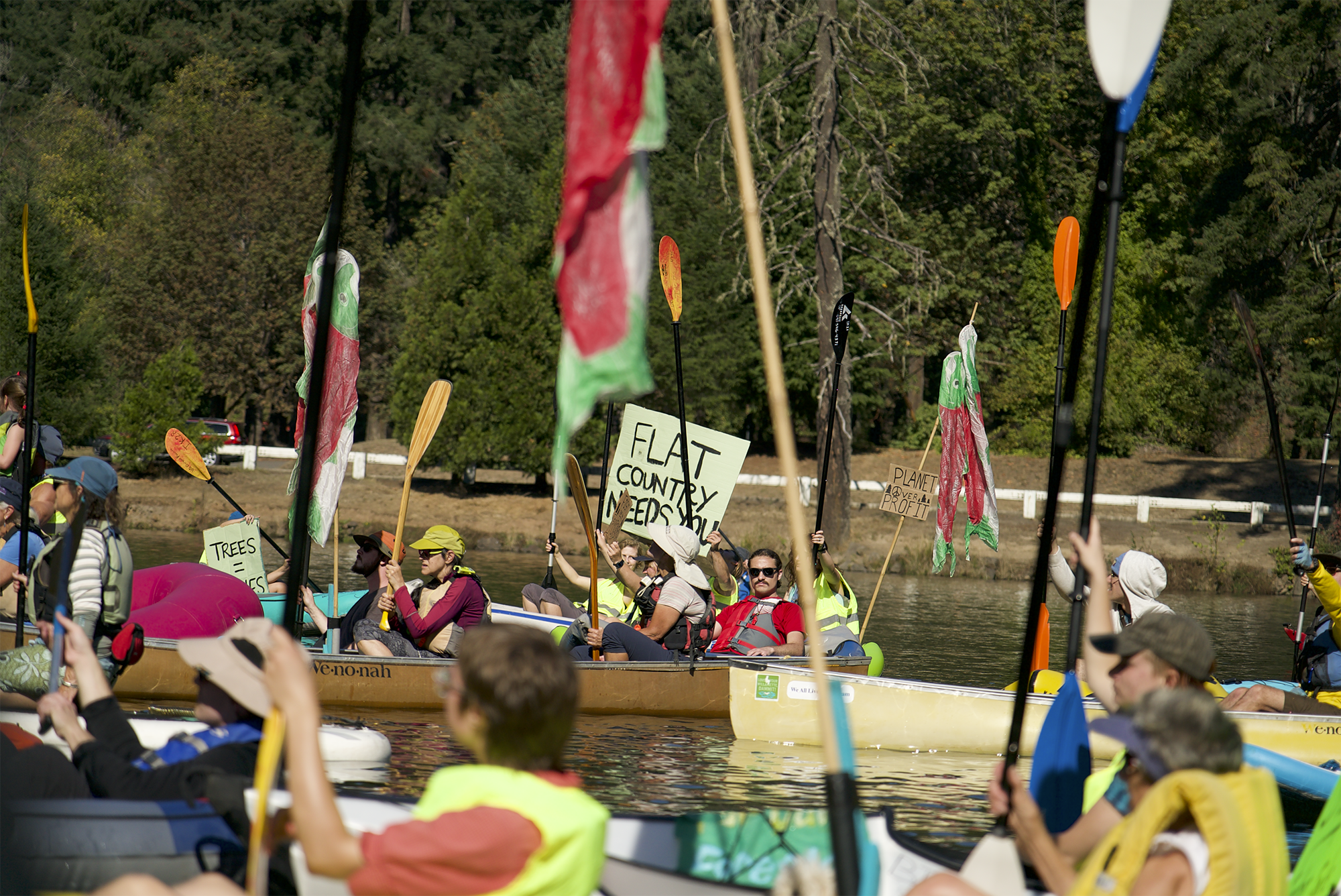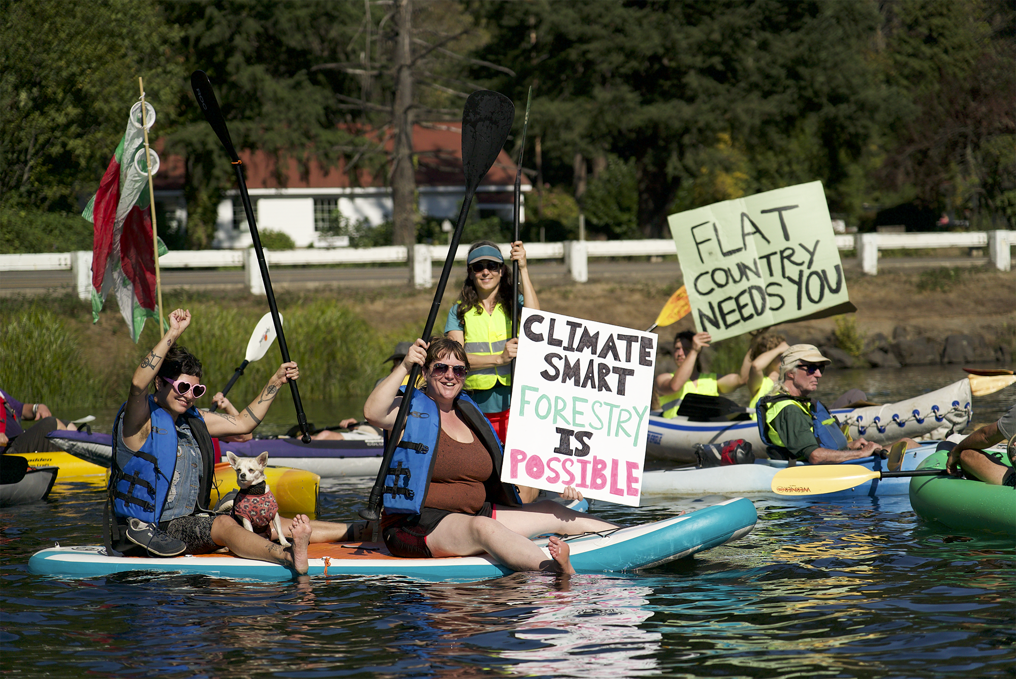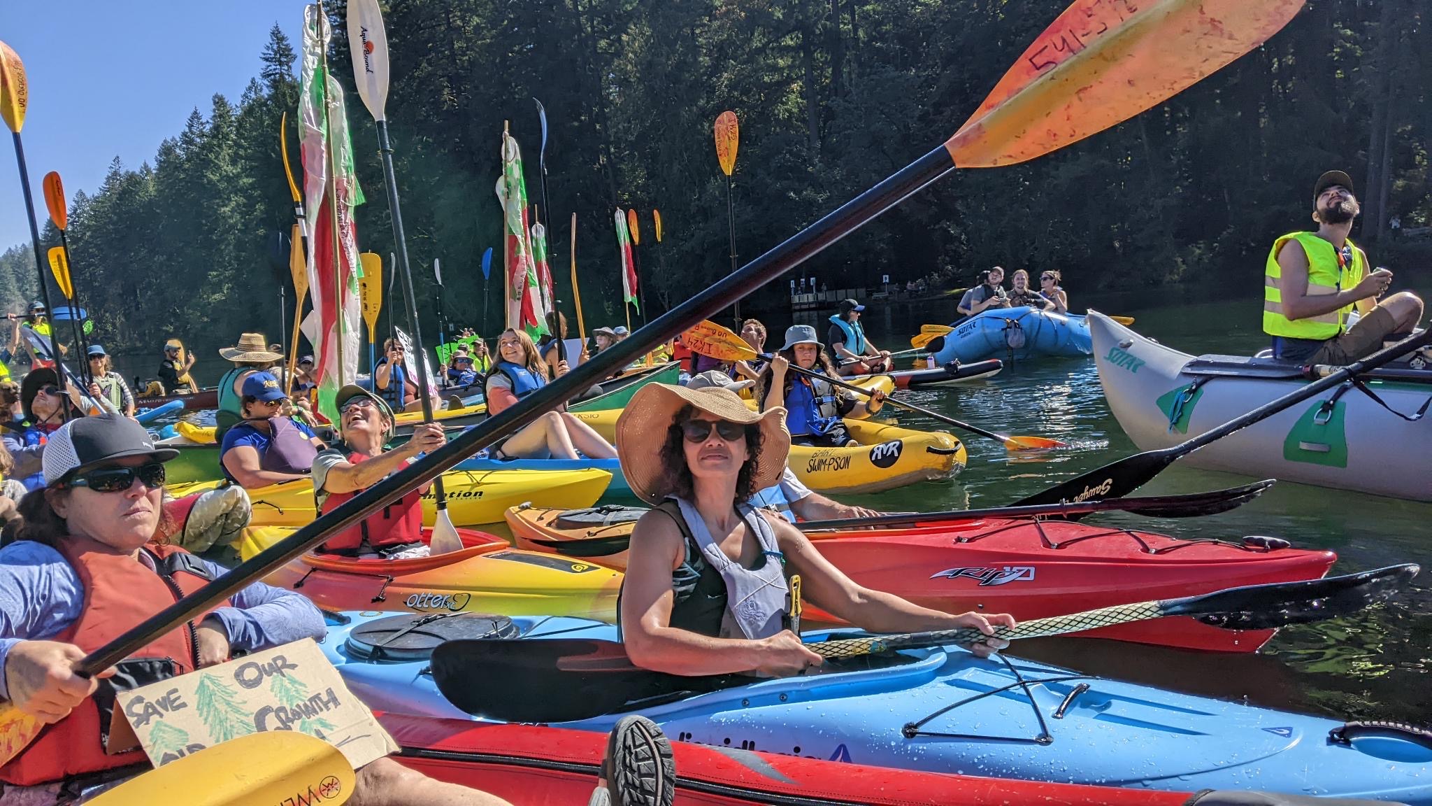 Climate and forest activists gathered for a flotilla on the McKenzie River to bring attention to the Flat Country old-growth logging sale in the Willamette National Forest