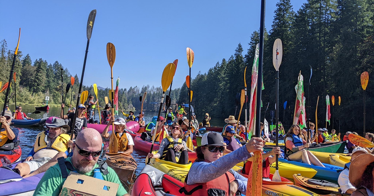 Leaburg, OREGON — Today, a “kayaktivist” flotilla of over 100 concerned community members rallied on the McKenzie River to protest an old-growth logging sale in the Willamette National Forest. The Flat Country project, proposed by the U.S. Forest Service, targets over 2,000 acres of old-growth and mature forests for logging across the headwaters of the McKenzie River. The agency could auction the old growth to be cut at any moment. Attendees held up signs from boats and kayaks, and unfurled a large banner declaring “Forest Defense is Watershed Defense”, to draw attention to the logging sale’s impact on downstream drinking water.