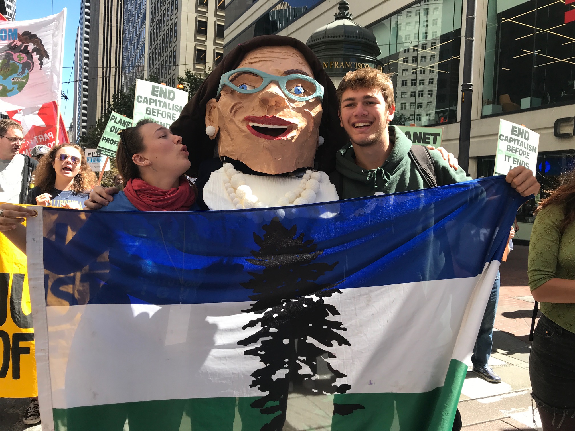 As Governor Kate Brown couldn’t make it to the important climate summit, we figured we’d bring Oregon’s resident ‘climate leader’ there in spirit. So, we drove the now infamous giant paper-mache replica of Governor Kate Brown’s head over 500 miles down to join the rally in San Francisco and show her commitment to a stable climate and sustainable future.