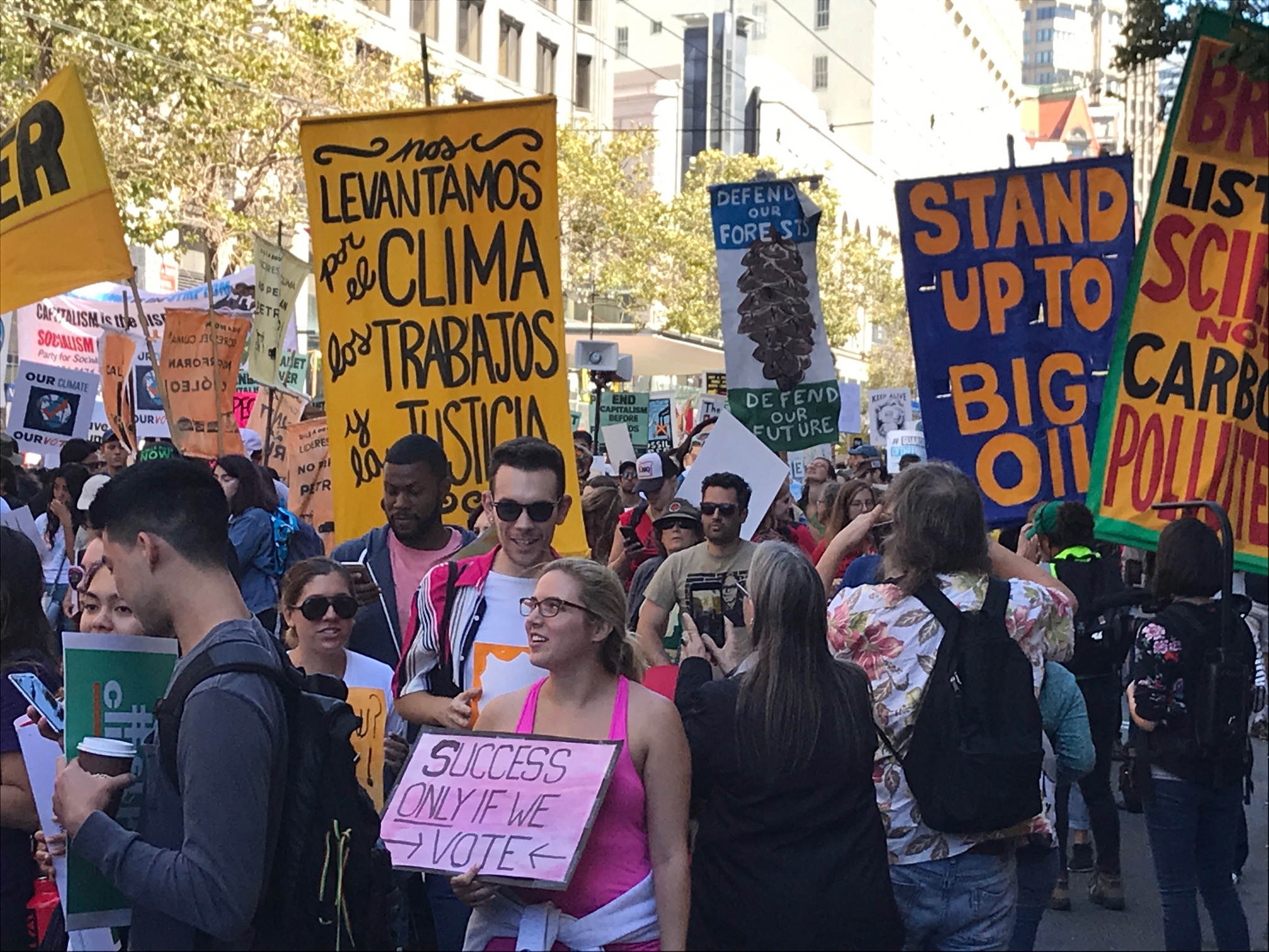 Chants of ‘keep it in the ground’ floated on the early morning breeze in downtown San Francisco as we joined tens of thousands of demonstrators gathering for the People’s Climate March. A sea of colorful banners waved against the morning light, reading things ranging from ‘Quaker’s against climate change’ to ‘water is life’ in the Ojibwe language mni wichoni The energy was intoxicating as children, elderly, students, tribal members, and activists of all stripes partook in the march, slowly and deliberately moving towards the distant city hall, where hundreds of organizations would converge in shared art, music and a common goal to stop the destruction wrought by the fossil fuel industry.