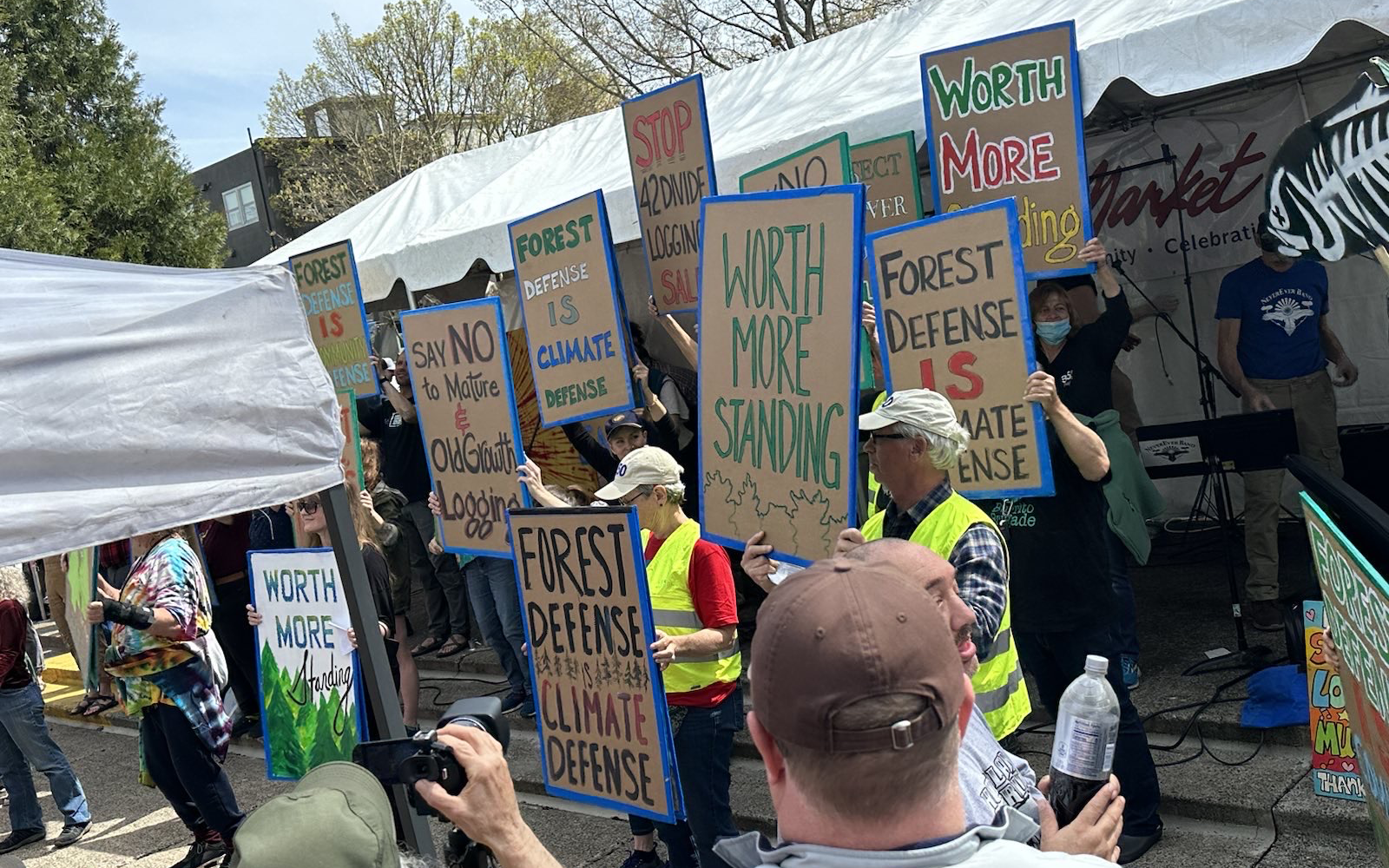 April 22, 2023 — Hundreds of concerned community members gathered Eugene, Oregon on Earth Day for a rally and demonstration in support of a proposed new national rule to protect mature and old-growth trees and forests on federally managed public lands. As thousands of acres of forests on public lands are threatened to be logged, members of the public were joined by Eugene Mayor Lucy Vinis and Eugene City Councilmember Matt Keating to urge federal agencies to protect mature and old-growth forests as a cornerstone of U.S. climate policy.