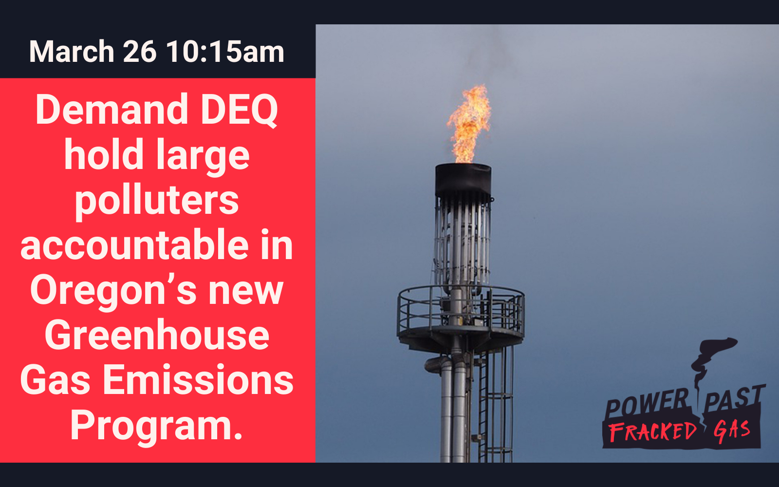 WHAT: Environmental Quality Commission WHEN: Friday, March 26 at 10:15am PSTTestify virtually to make sure climate polluters aren’t exempt from regulation! The Oregon Department of Environmental Quality (DEQ) is in the early stages of developing a new greenhouse gas reduction program. This program is the centerpiece of Governor Brown’s 2020 Executive Order on climate change, … Continue reading No Free Pass for Dirty Fracked Gas!