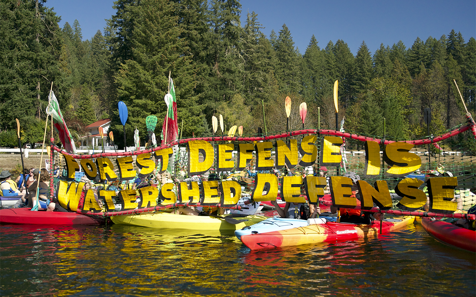 October 8, 2022 — Today, a “kayaktivist” flotilla of over 100 concerned community members rallied on the McKenzie River to protest an old-growth logging sale in the Willamette National Forest. The Flat Country project, proposed by the U.S. Forest Service, targets over 2,000 acres of old-growth and mature forests for logging across the headwaters of the McKenzie River. The agency could auction the old growth to be cut at any moment.   Attendees held up signs from boats and kayaks, and unfurled a large banner declaring “Forest Defense is Watershed Defense”, to draw attention to the logging sale’s impact on downstream drinking water.