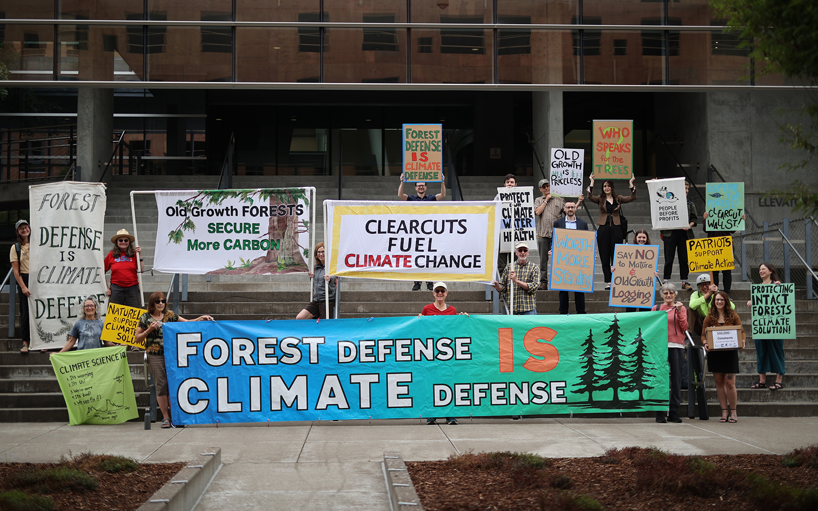 Thursday, July 20, 2023 — More than 500,000 people have submitted public comments to the U.S. Forest Service calling for the agency to adopt a rule that protects mature and old-growth trees and forests on federal land as a cornerstone of U.S. climate policy. Activists were joined by organizers from the Climate Forests Campaign, a coalition which includes Oregon Wild, Cascadia Wildlands, and WildEarth Guardians, to deliver some of these public comments at an event at the Wayne Morse Federal Courthouse in Eugene on Thursday, July 20, 2023.