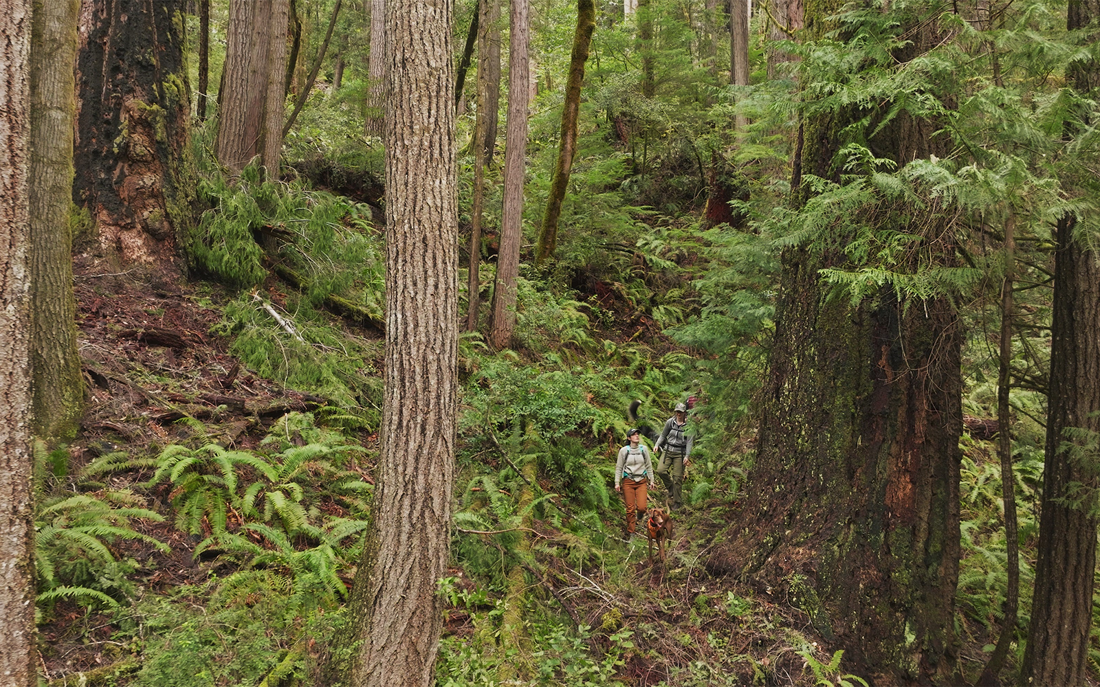 A bright green forest lets dappled sunlight through. A volunteer stands to the right, dwarfed by the trees.