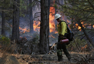 Ryan Andrade, a member of the Redmond Hot Shots ignites brush while helping start a prescribed burn in Deschutes National Forest land west of Bend in 2017 (photo by Joe Kline/Bend Bulletin).