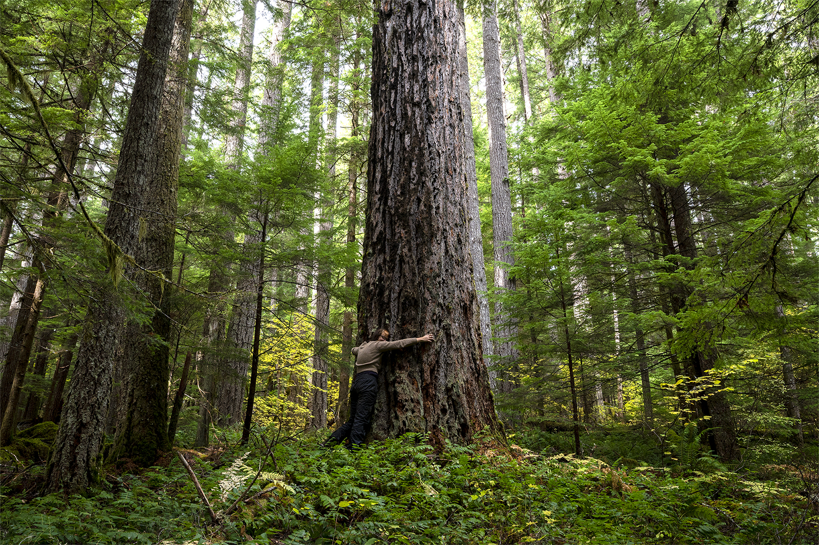 Grassroots and Field Manager, Madeline Cowen, embraces an old-growth Douglas fir in the Willamette National Forest, now at risk of privatization. Photo by: Andrew Kumler.