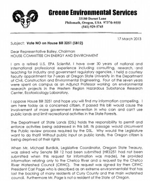 Page one of Joe Greene Chetco Letter